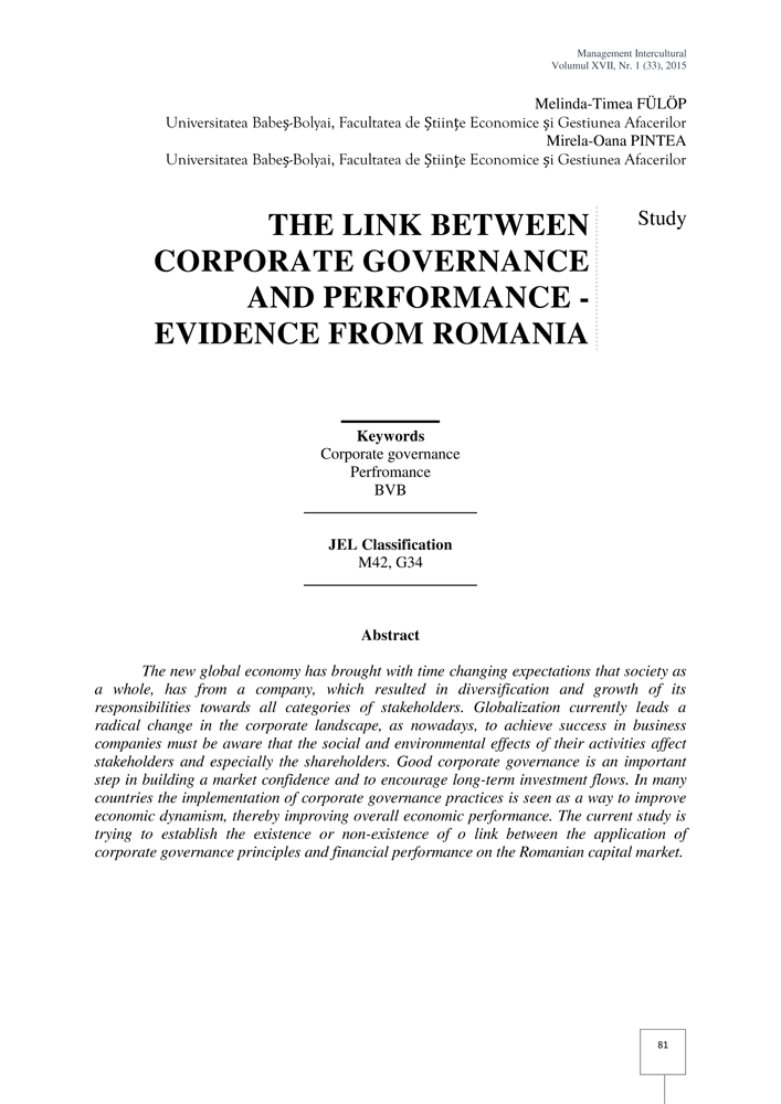 - Keywords: Corporate governance, Perfromance, BVB