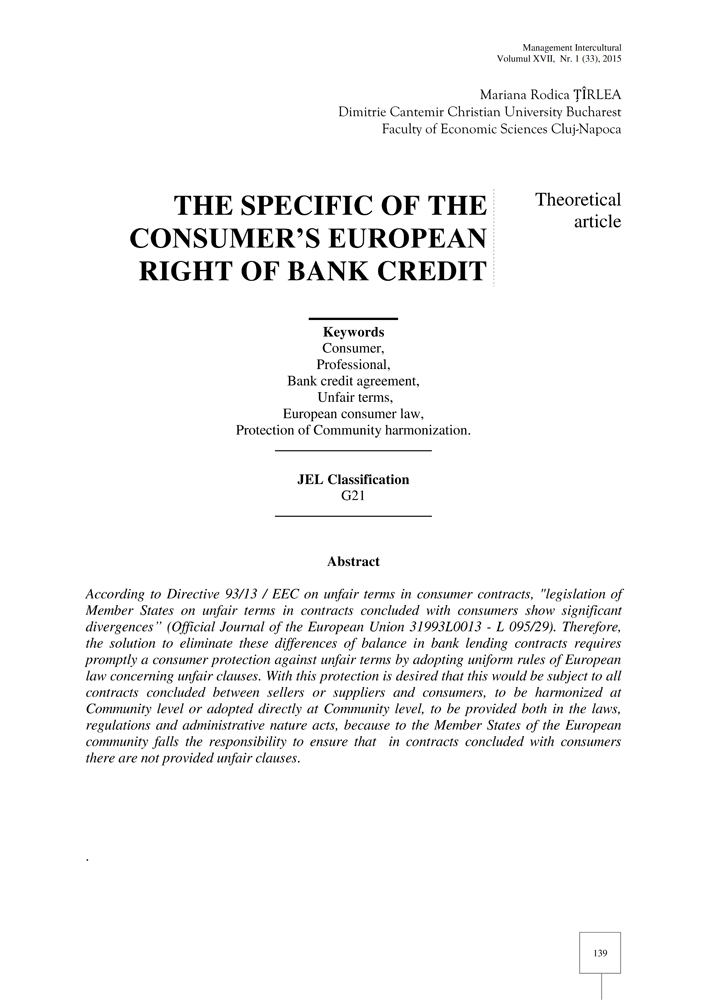 - Keywords: Consumer, Professional, Bank credit agreement, Unfair terms, European consumer law, Protection of Community harmonization