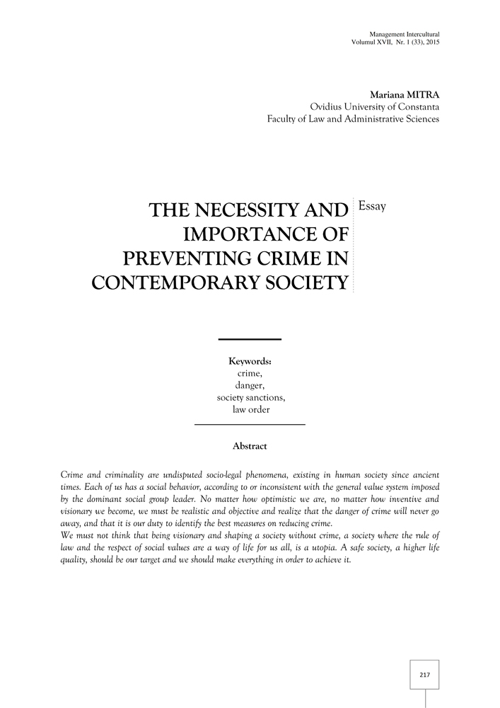 Crime and criminality are undisputed socio-legal phenomena, existing in human society since ancient times. Each of us has a social behavior, according to or inconsistent with the general value system imposed by the dominant social group leader. No matter how optimistic we are, no matter how inventive and visionary we become, we must be realistic and objective and realize that the danger of crime will never go away, and that it is our duty to identify the best measures on reducing crime. We must not think that being visionary and shaping a society without crime, a society where the rule of law and the respect of social values are a way of life for us all, is a utopia. A safe society, a higher life quality, should be our target and we should make everything in order to achieve it.