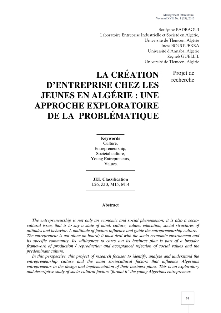The entrepreneurship is not only an economic and social phenomenon; it is also a socio-cultural issue, that is to say a state of mind, culture, values, education, social structures of attitudes and behavior. A multitude of factors influence and guide the entrepreneurship culture. The entrepreneur is not alone on board; it must deal with the socio-economic environment and its specific community. Its willingness to carry out its business plan is part of a broader framework of production / reproduction and acceptance/ rejection of social values and the predominant culture. In this perspective, this project of research focuses to identify, analyze and understand the entrepreneurship culture and the main sociocultural factors that influence Algerians entrepreneurs in the design and implementation of their business plans. This is an exploratory and descriptive study of socio-cultural factors "format it" the young Algerians entrepreneur.