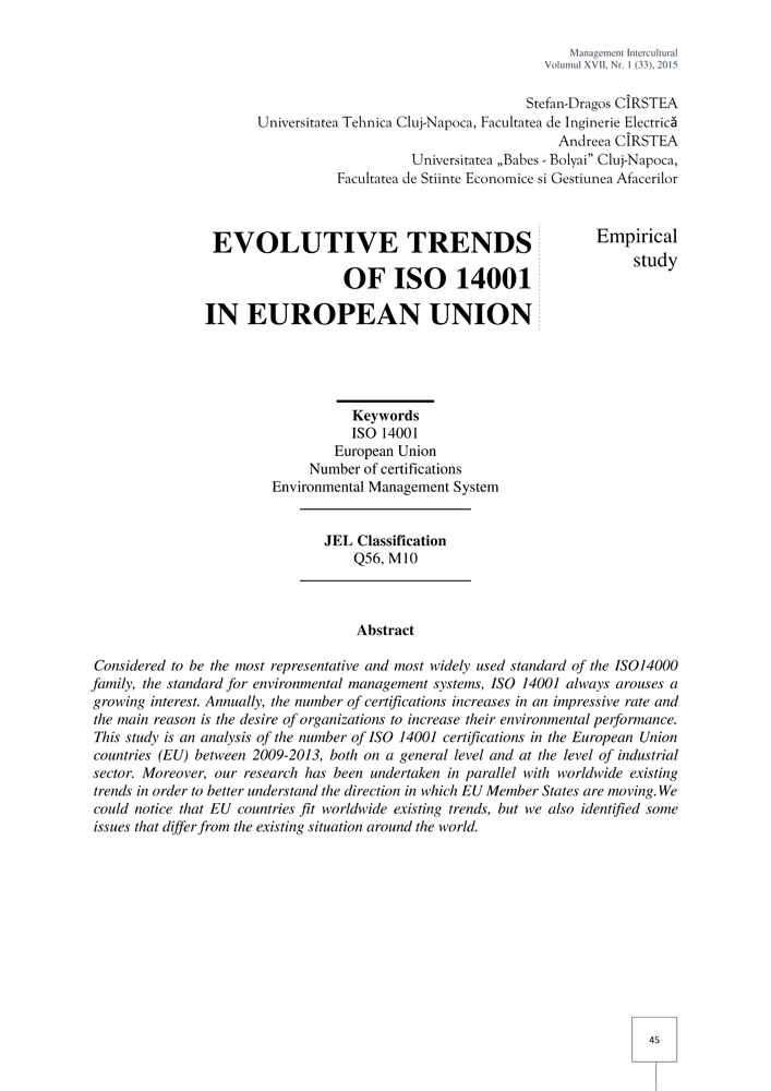 - Keywords: ISO 14001, European Union, Number of certifications, Environmental Management System