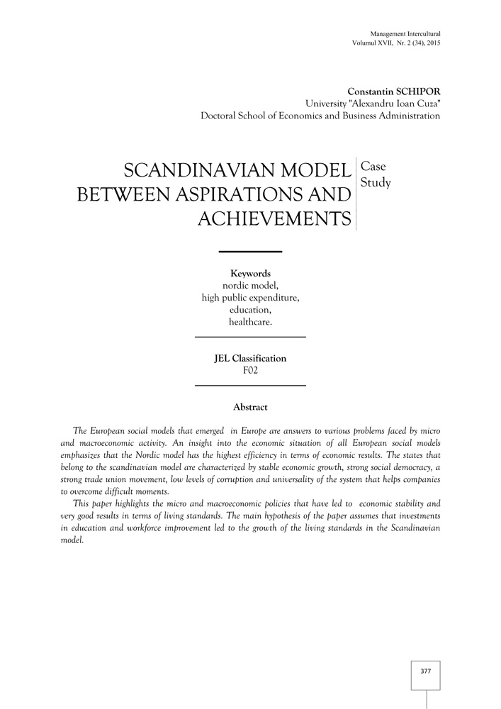 The European social models that emerged in Europe are answers to various problems faced by micro and macroeconomic activity. An insight into the economic situation of all European social models emphasizes that the Nordic model has the highest efficiency in terms of economic results. The states that belong to the scandinavian model are characterized by stable economic growth, strong social democracy, a strong trade union movement, low levels of corruption and universality of the system that helps companies to overcome difficult moments.This paper highlights the micro and macroeconomic policies that have led to economic stability and very good results in terms of living standards. The main hypothesis of the paper assumes that investments in education and workforce improvement led to the growth of the living standards in the Scandinavian model.
