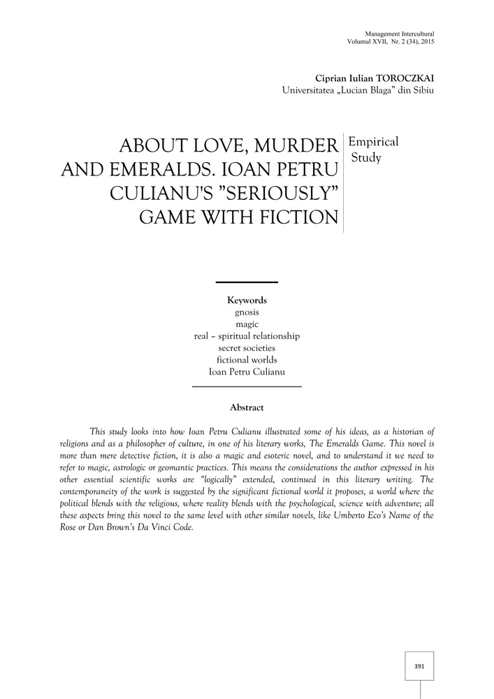 This study looks into how Ioan Petru Culianu illustrated some of his ideas, as a historian of religions and as a philosopher of culture, in one of his literary works, The Emeralds Game. This novel is more than mere detective fiction, it is also a magic and esoteric novel, and to understand it we need to refer to magic, astrologic or geomantic practices. This means the considerations the author expressed in his other essential scientific works are “logically” extended, continued in this literary writing. The contemporaneity of the work is suggested by the significant fictional world it proposes, a world where the political blends with the religious, where reality blends with the psychological, science with adventure; all these aspects bring this novel to the same level with other similar novels, like Umberto Eco’s Name of the Rose or Dan Brown’s Da Vinci Code.