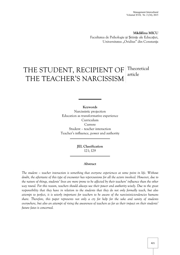 The student – teacher interaction is something that everyone experiences at some point in life. Without doubt, the aftertaste of this type of encounter has repercussions for all the actors involved. However, due to the nature of things, students’ lives are more prone to be affected by their teachers’ influence than the other way round. For this reason, teachers should always use their power and authority wisely. Due to the great responsibility that they have in relation to the students that they do not only formally teach, but also attempt to perfect, it is utterly important for teachers to be aware of the narcissistictendencies humans share. Therefore, this paper represents not only a cry for help for the sake and sanity of students everywhere, but also an attempt of rising the awareness of teachers as far as their impact on their students’ future fates is concerned.
