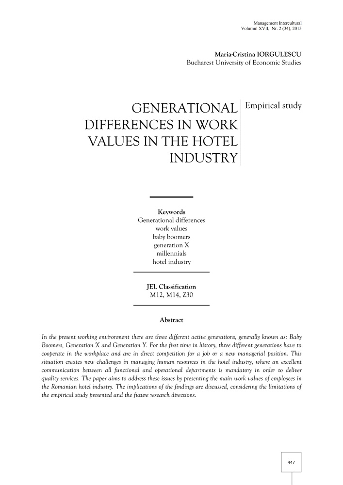 - Keywords: generational differences, work values, baby boomers, generation X, millennials, hotel industry