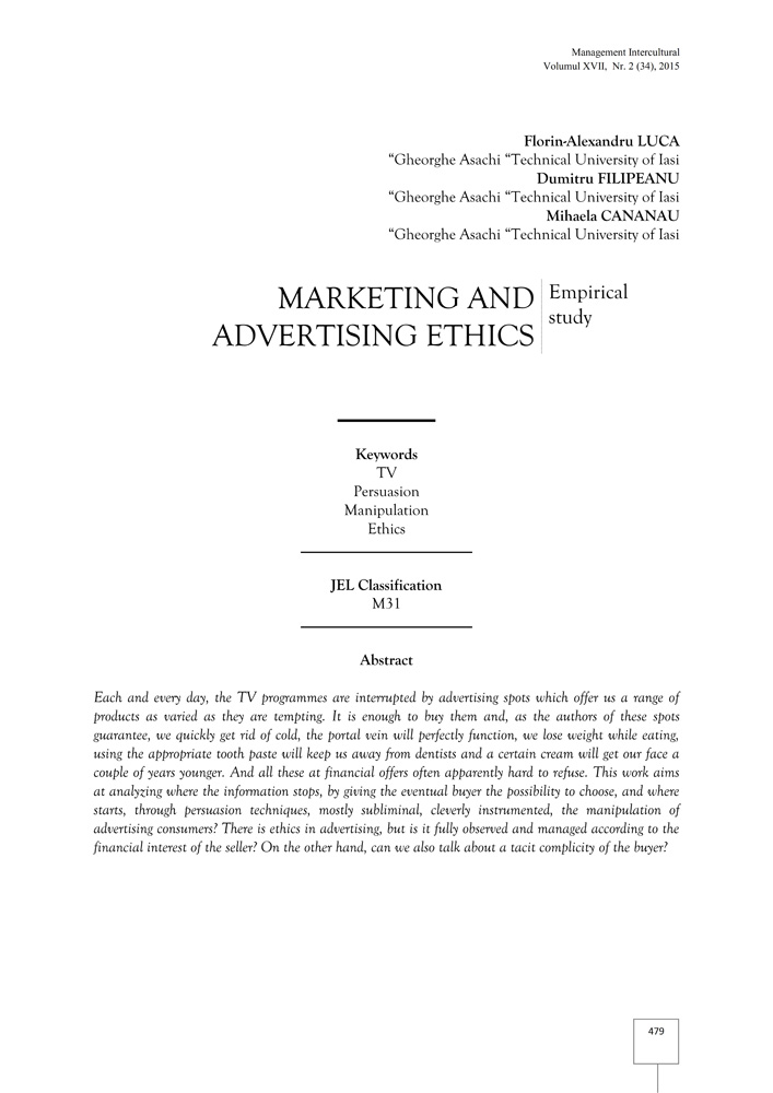 Each and every day, the TV programmes are interrupted by advertising spots which offer us a range of products as varied as they are tempting. It is enough to buy them and, as the authors of these spots guarantee, we quickly get rid of cold, the portal vein will perfectly function, we lose weight while eating, using the appropriate tooth paste will keep us away from dentists and a certain cream will get our face a couple of years younger. And all these at financial offers often apparently hard to refuse. This work aims at analyzing where the information stops, by giving the eventual buyer the possibility to choose, and where starts, through persuasion techniques, mostly subliminal, cleverly instrumented, the manipulation of advertising consumers? There is ethics in advertising, but is it fully observed and managed according to the financial interest of the seller? On the other hand, can we also talk about a tacit complicity of the buyer?