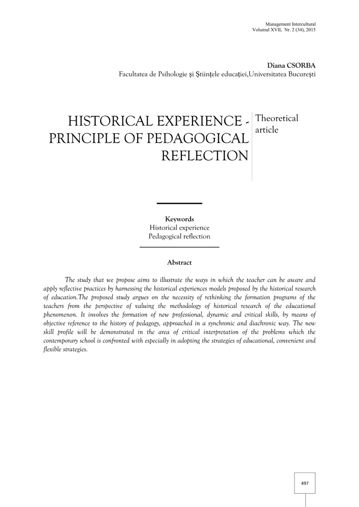 The study that we propose aims to illustrate the ways in which the teacher can be aware and apply reflective practices by harnessing the historical experiences models proposed by the historical research of education.The proposed study argues on the necessity of rethinking the formation programs of the teachers from the perspective of valuing the methodology of historical research of the educational phenomenon. It involves the formation of new professional, dynamic and critical skills, by means of objective reference to the history of pedagogy, approached in a synchronic and diachronic way. The new skill profile will be demonstrated in the area of critical interpretation of the problems which the contemporary school is confronted with especially in adopting the strategies of educational, convenient and flexible strategies.
