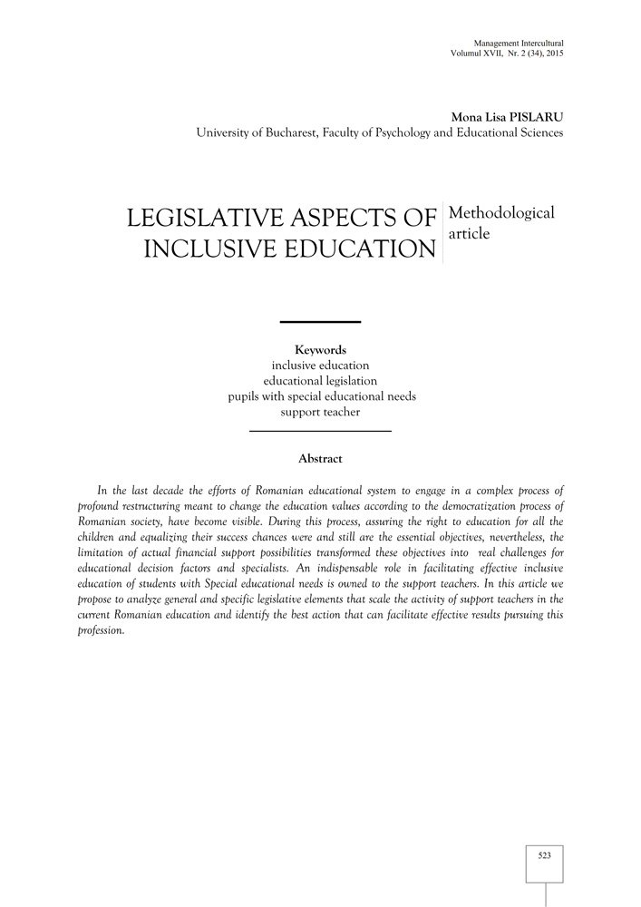 - Keywords: inclusive education, educational legislation, pupils with special educational needs, support teacher