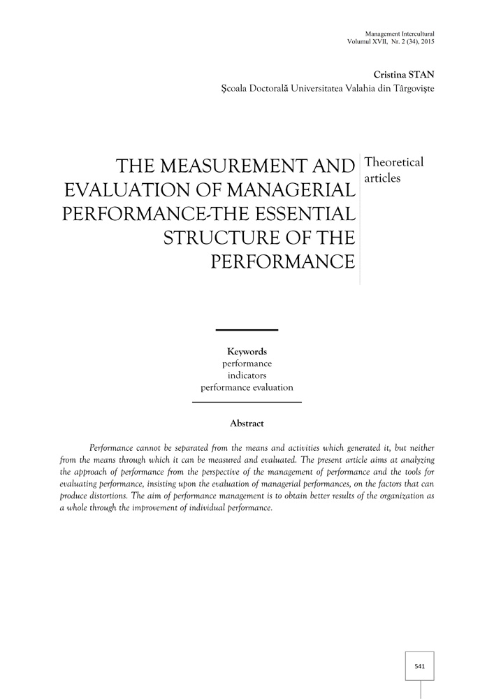 Performance cannot be separated from the means and activities which generated it, but neither from the means through which it can be measured and evaluated. The present article aims at analyzing the approach of performance from the perspective of the management of performance and the tools for evaluating performance, insisting upon the evaluation of managerial performances, on the factors that can produce distortions. The aim of performance management is to obtain better results of the organization as a whole through the improvement of individual performance.