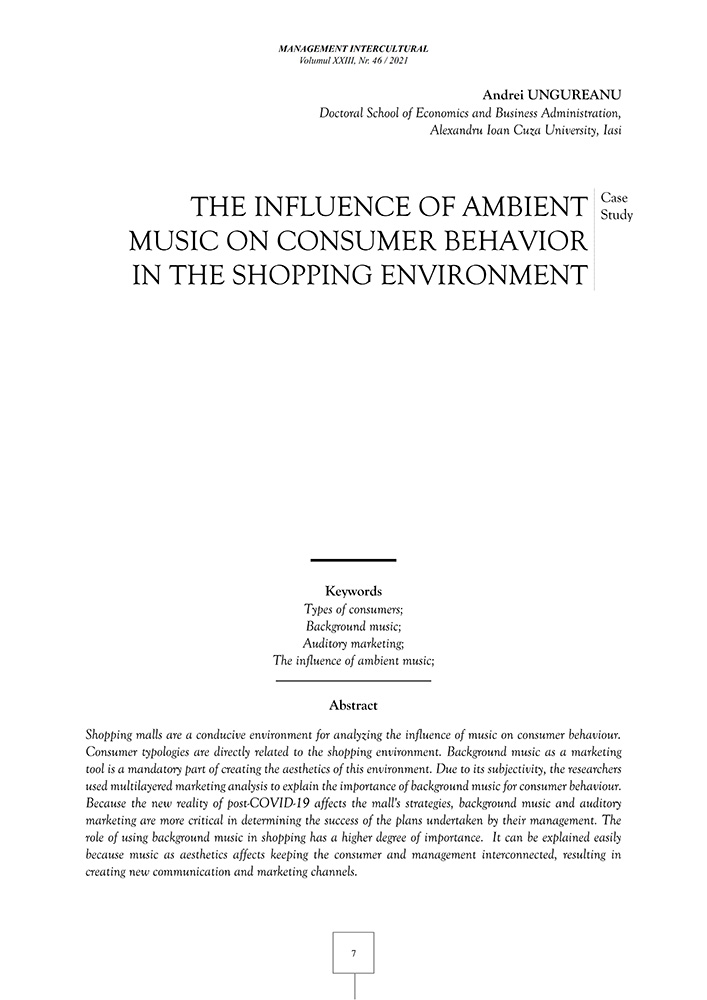 Shopping malls are a conducive environment for analyzing the influence of music on consumer behaviour. Consumer typologies are directly related to the shopping environment. Background music as a marketing tool is a mandatory part of creating the aesthetics of this environment. Due to its subjectivity, the researchers used multilayered marketing analysis to explain the importance of background music for consumer behaviour. Because the new reality of post-COVID-19 affects the mall's strategies, background music and auditory marketing are more critical in determining the success of the plans undertaken by their management. The role of using background music in shopping has a higher degree of importance. It can be explained easily because music as aesthetics affects keeping the consumer and management interconnected, resulting in creating new communication and marketing channels.