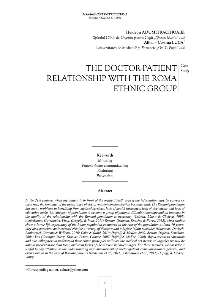 In the 21st century, when the patient is in front of the medical staff, even if the information may be correct or incorrect, the reminder of the importance of doctor-patient communication becomes vital. The Romani population has many problems in benefiting from medical services, lack of health insurance, lack of documents and lack of education make this category of population to become a group of patients difficult to manage and an increase in the quality of the relationship with the Romani population is necessary (Cristea, Lăte,a & Chelcea, 1997; Astărăstoae, Gavrilovici, Vicol, Gergely, & Ioan, 2011; Roman, Gramma, Enache, & Pârvu, 2012). Most studies show a lower life expectancy of the Roma population compared to the rest of the population at least 10 years, they also associate an increased risk for a variety of diseases and a higher infant mortality (Hanssens, Devisch, Lobbestael, Cottenie & Willems, 2016; Cahn & Guild, 2010; Hajioff, & McKee, 2000; Zeman, Depken, Senchina, 2003; Van Cleemput, Parry, Thomas, Peters, Cooper, 2007; Hajioff & McKee, 2000). Roma access to education and our willingness to understand their ethnic principles will turn the medical act better, so together we will be able to prevent more than treat, and treat forms of the disease in easier stages. For these reasons, we consider it useful to pay attention to the understanding and improvement of doctor-patient communication in general, and even more so in the case of Romani patients (Hanssens et al., 2016; Astărăstoae et al., 2011; Hajioff, & McKee, 2000).